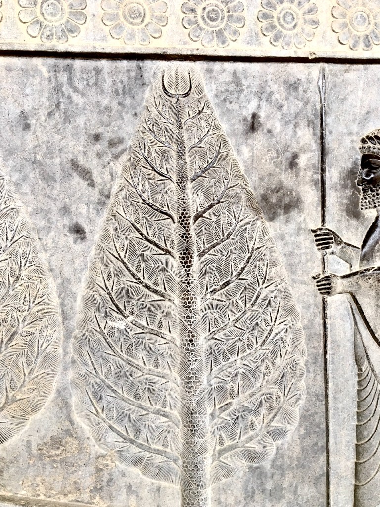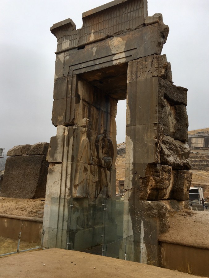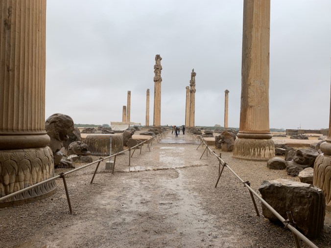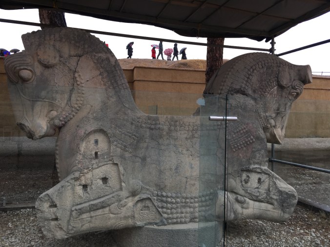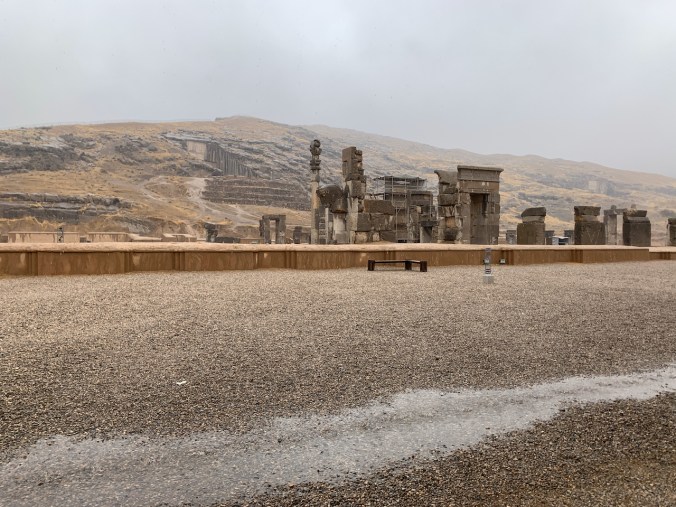 Rain was still coming down in the morning, but we braved the elements and walked from the hotel to the vast and impressive ruins of Persepolis. One of the chief virtues of the Apadana Hotel is its proximity to the archaeological site, so it took only a few minutes walk to arrive. On our way there, we saw the tree-lined avenue that the notorious Shah Mohammed Reza Pahlevi had constructed for a grand celebration of the 2500th anniversary of the Persian Empire in 1972. He had planted 2500 trees to commemorate the occasion. Nate had told us that he may have spent as much as a billion dollars on the festivities, which were perhaps the beginning of the end for him since popular opinion was not supportive of the expensive celebration.