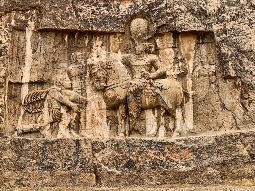 Down at ground level, below the entrances to the tombs, are several massive relief sculptures from the Sasanian dynasty, which were carved some 700-800 years after the royal tombs were constructed. The most impressive of these is a relief of King Shapur I who defeated a Roman army led by Emperor Valerian in 257 CE at the Battle of Edessa in upper Mesopotamia. Shapur is shown with Emperor Valerian as his captive, the one and only time that any Roman emperor was captured by a foreign enemy.