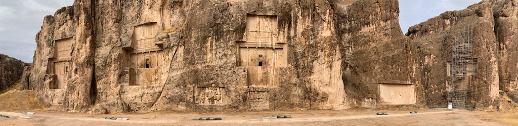 In the panoramic photo below, going from left to right, the tombs belong to Darius II (ruled 423-404 BCE) , Artaxerxes I (465-424-BCE), Darius I “the Great” (522-486 BCE) and Xerxes I (486-465 BCE). The blank rock face between the last two tombs is the unfinished tomb of Darius III (336-330 BCE). Click on the image below for a larger version.