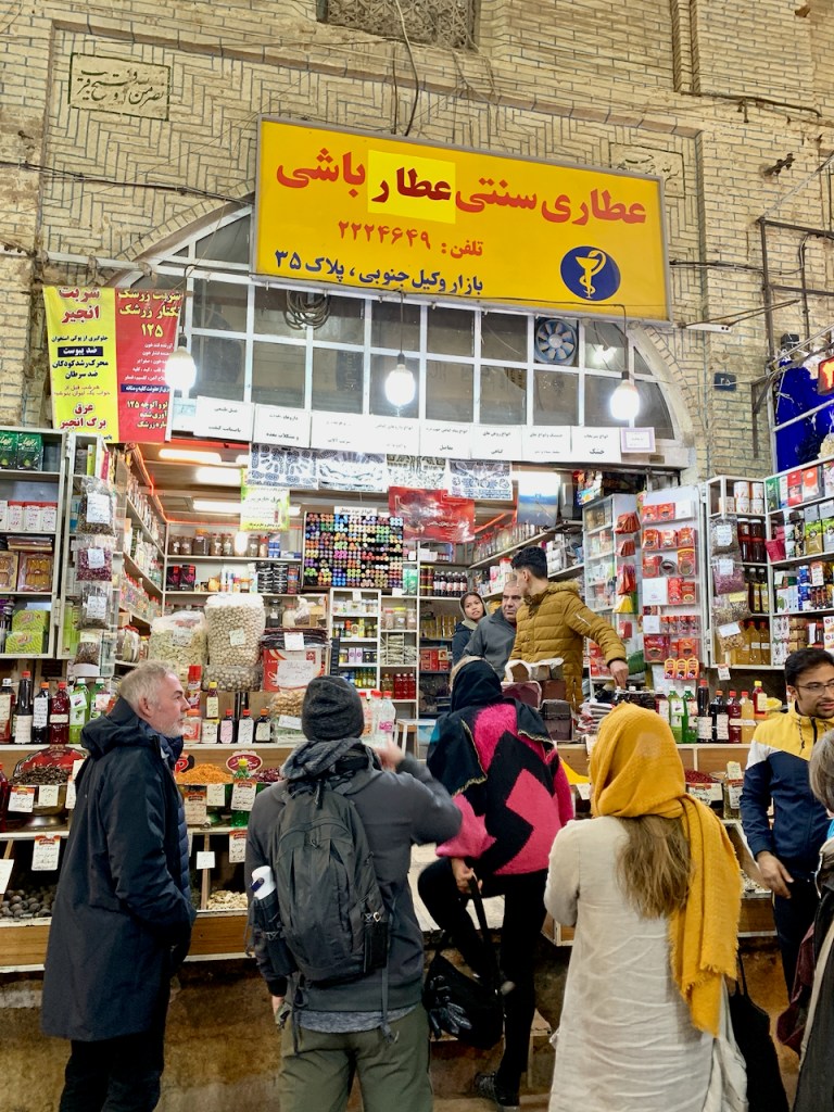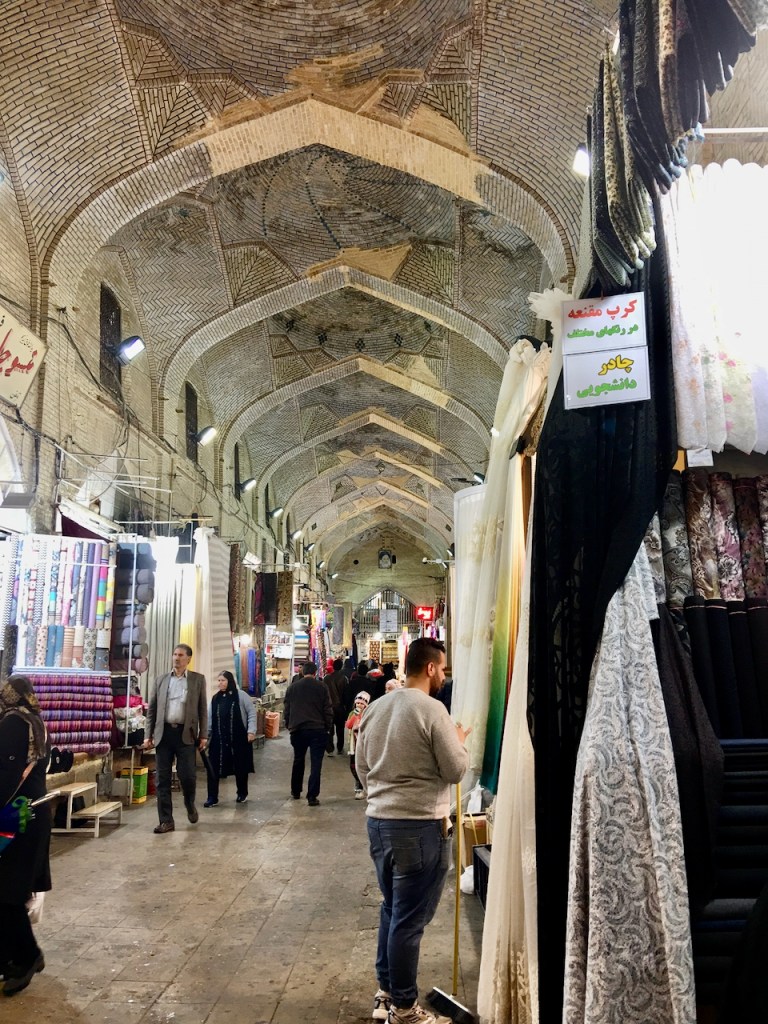 After getting settled in our rooms, around 3:45 pm we set out for the Vakil Bazaar. We actually had some shopping in mind, especially some kind of container in which to transport the clock we’d bought in Esfahan. With Vahid’s invaluable guidance eventually paid all of $5 for a lovely soft-sided bag which was just the right size. It was also small enough, as it happened, to go as carry-on luggage on our flights home.