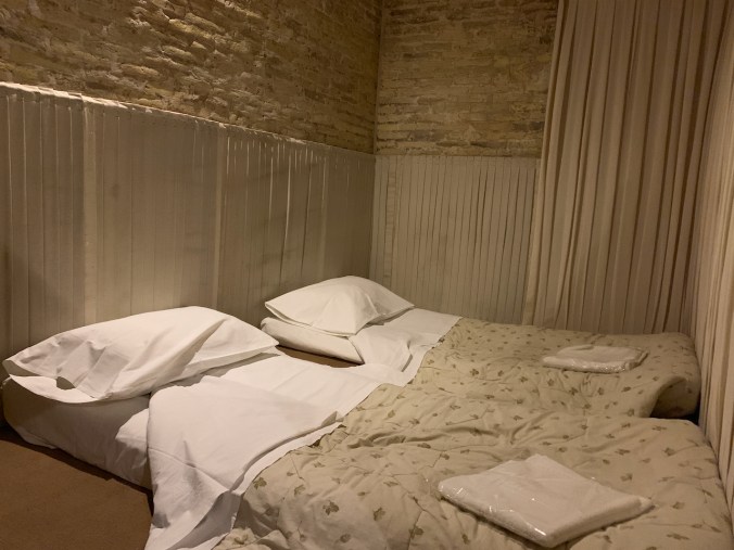 Our group occupied rooms in one wing of the caravanserai. Each room was simply a curtained-off section of a platform along the outer wall of the building. The beds were simply futon-like mattresses on the floor. The room had plenty of clean linen and, even though the weather outside was quite cold, we were very comfortable.