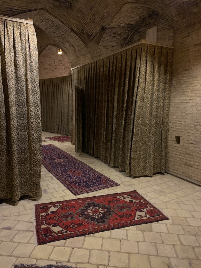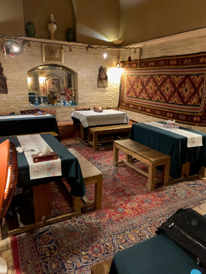 We took it easy in the morning. We had breakfast at the hotel and made a late departure from Yazd, Our first stop was supposed to be the Yazd Water Museum, but it was closed, probably because of the protests; the bonfire we’d seen the previous night was right at the intersection where the museum is located.