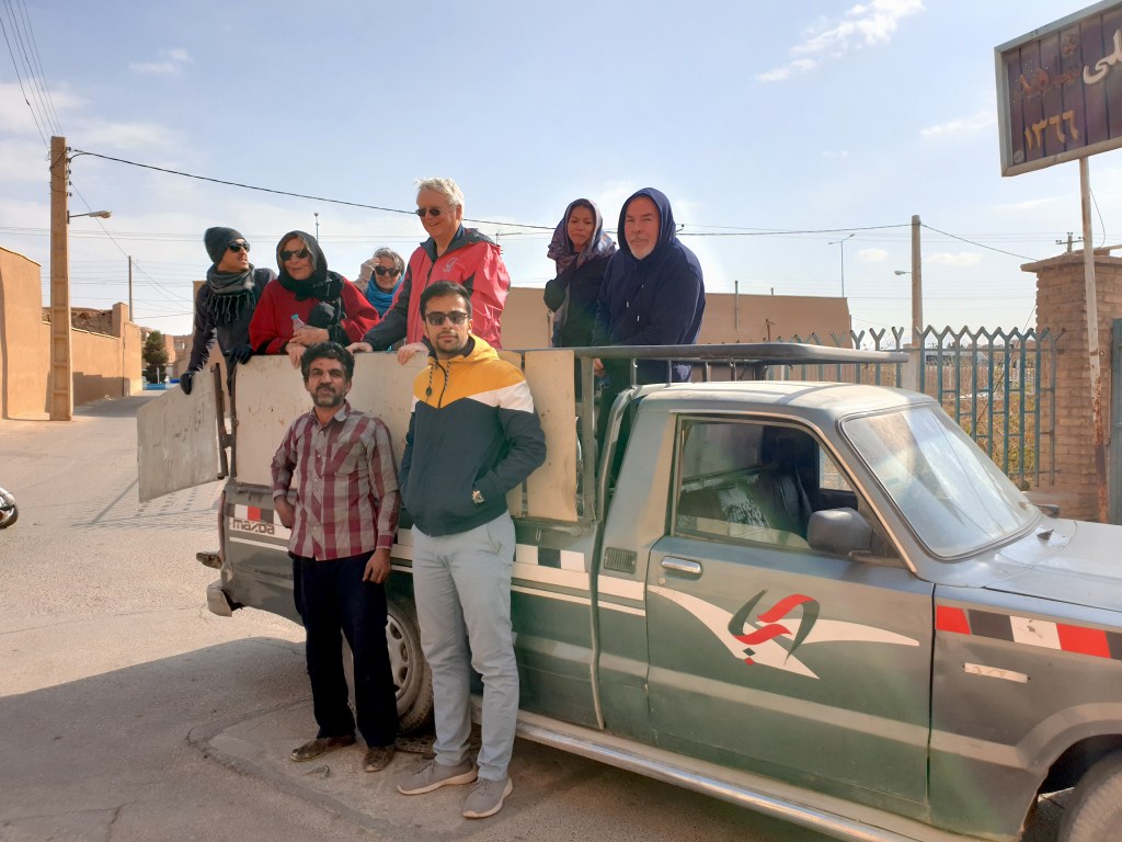 We decided the best thing to do was just to get out and walk. While our bus driver Mori stayed behind with the bus, we got to the intersection where the blockage started and turned left to walk down another major road. After we’d walked some distance, Vahid managed to flag down a private car and a pickup truck, whose drivers gave us all rides to the restaurant where we’d arranged to have lunch. This was surely way out of the way for both drivers. Incredible kindness on the parts of the Iranians! Neither driver would accept money for their troubles.