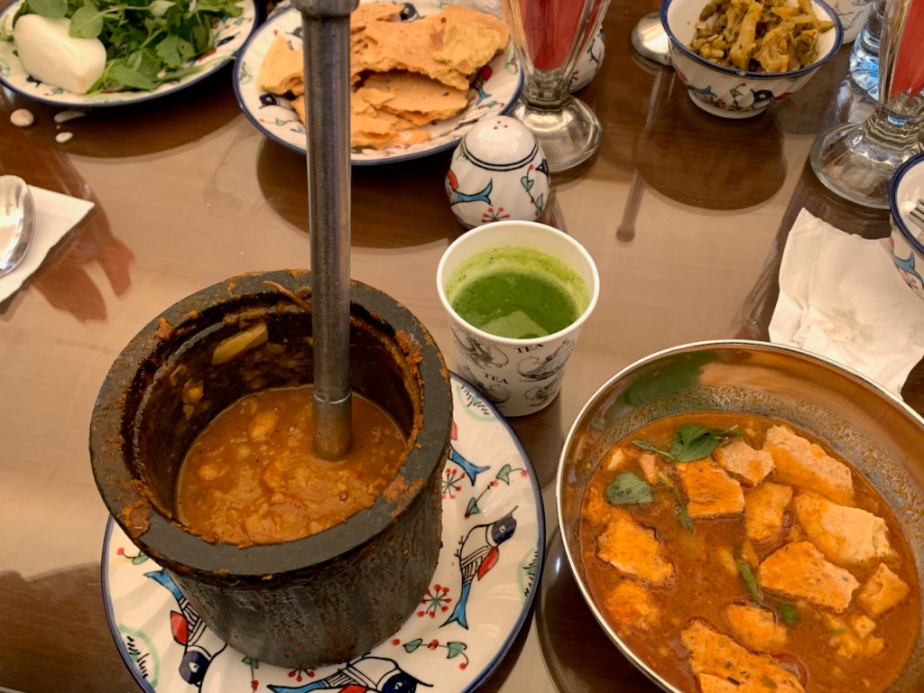 Our lunch destination was the Tahmoures Historical Restaurant where Vahid had arranged a meal of an Iranian dish called dizi, which is a combination soup and stew and which apparently means “meat” in Farsi. The waiters brought it to the table in very hot stone pots that they had to handle with tongs. They strained off much of the liquid into soup bowls that we’d been instructed to put bits of crumbled cracker into. This left a very thick stew in the stone pots, which we proceeded to mash with heavy metal mashers that were part of the table settings. The ingredients were lamb, potatoes, chickpeas, tomatoes, and some spices—and the results were delicious.