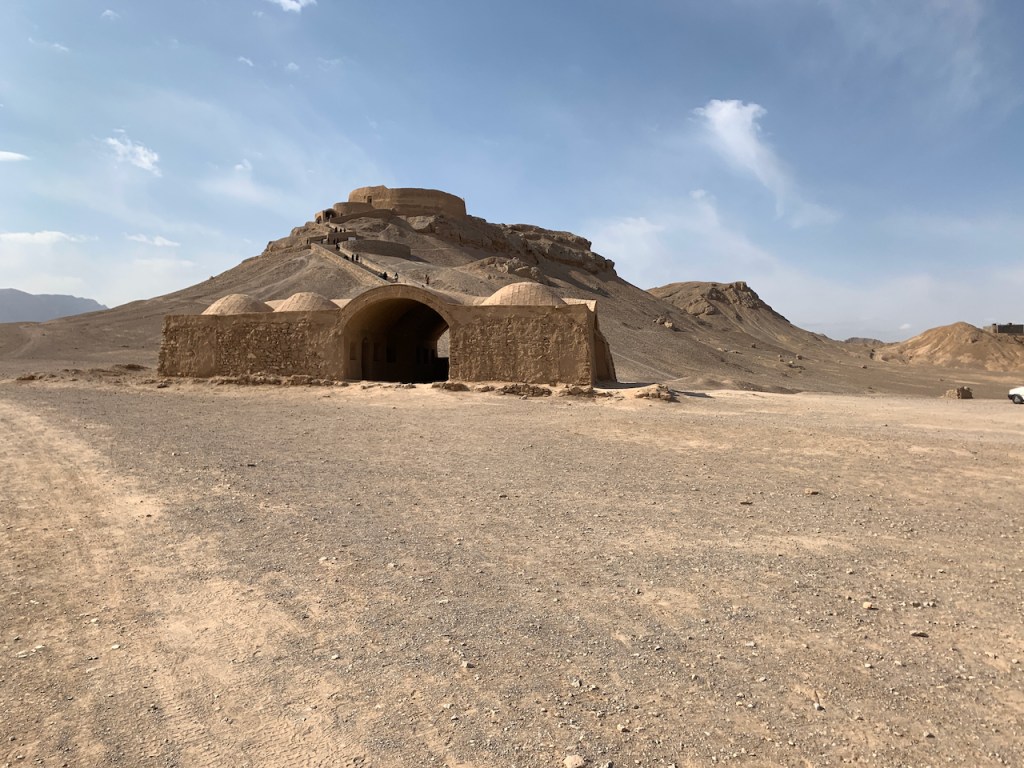 The first stop was at two Zoroastrian Towers of Silence on the edge of the city near Highway 71, the road that connects Tehran to the Persian Gulf. These towers are the places where Zoroastrians would bring deceased family members for final rites. The compound below the towers is comprised of several of small buildings in which family members of the deceased could stay during the ceremony. Because a cold wind was blowing, our group took shelter in one of these to listen to a brief lecture by Vahid on Zoroastrianism.