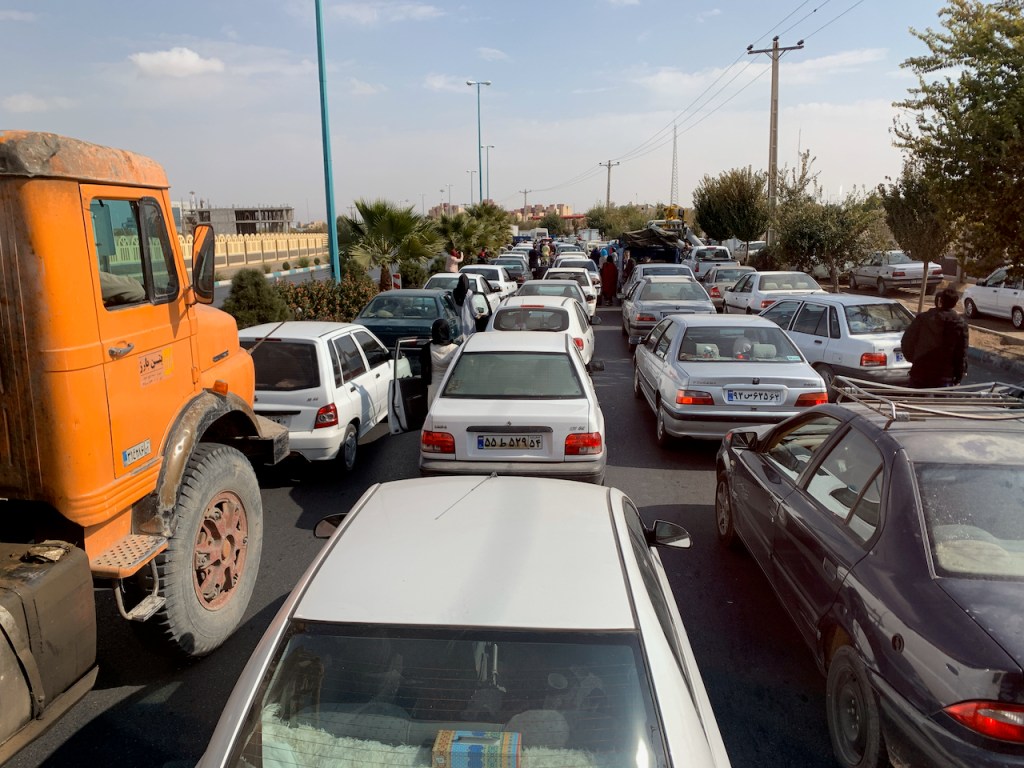 Leaving these Towers of Silence, our destination was another Persian garden. We didn’t make it. Instead, we ran into a massive traffic jam caused by many people intentionally stopping their vehicles at the major roundabout as a protest against the recent increases in the prices of gasoline, as well as the imposition of rationing.
