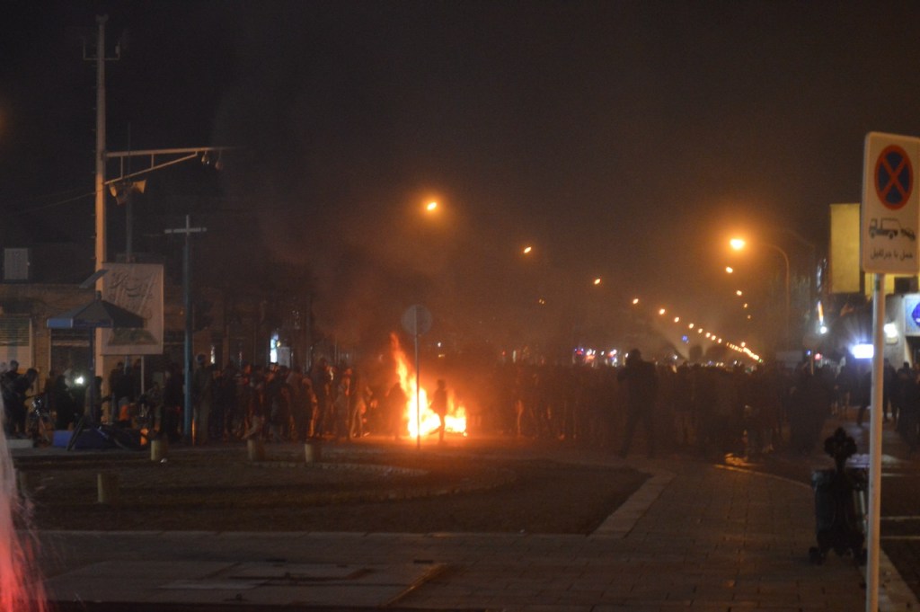 When the performance was over, Philippa bought a box of the Iranian version of cotton candy to share with everyone at a shop near the roadway roundabout. There we saw a continuation of the earlier protests, this time in the form of a large bonfire in the middle of the intersection. Even though we didn’t witness them, the protests in days to come became much more serious. Reports are that at least several hundred people were killed.