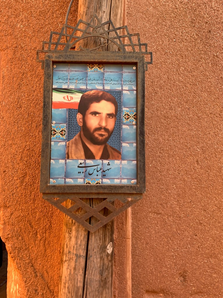 In Meybod, as in many cities that we drove through, the median strips in the highway were lined with poles supporting photographs of local men who had died in the Iran-Iraq War of the 1980s. Many private businesses also displayed posters of the men who had worked there and had been killed in the war. In the United States one may need to visit a military cemetery to appreciate the human cost of war. In Iran seeing the memorials is a daily experience. This war was a tremendously devastating event for the people of Iran, who lost a large part of a generation of young men. Our bus was moving too fast to capture good images. The photo above, on a house wall in Abyaneh, is a good example of this type of memorial.