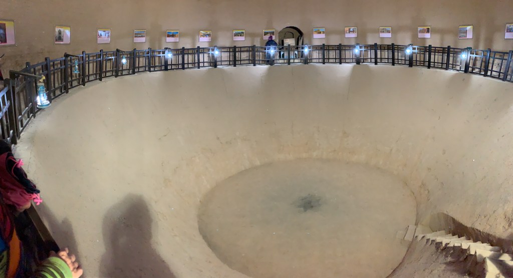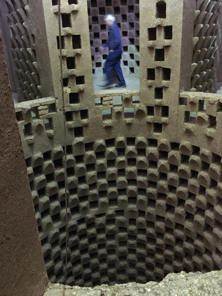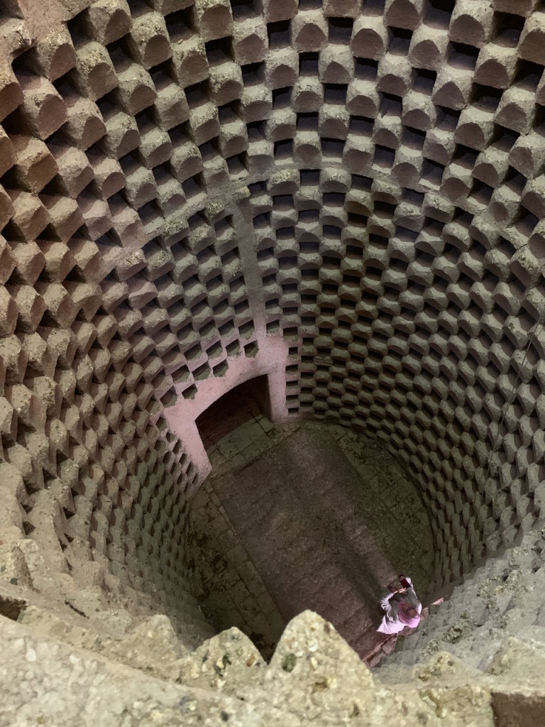 Across the street from the restaurant we entered a former icehouse. There were two shallow, rectangular pools (no water in them now) in front of the icehouse. In the days when the icehouse was in use, during the colder parts of the year attendants would fill these pools with water and let it freeze overnight. In the morning they’d transfer the ice to the large building adjacent to it, which consisted of a large cone-shaped depression into which the ice would be dumped. The thick walls and dome above the ice repository preserved the ice for much of the year.